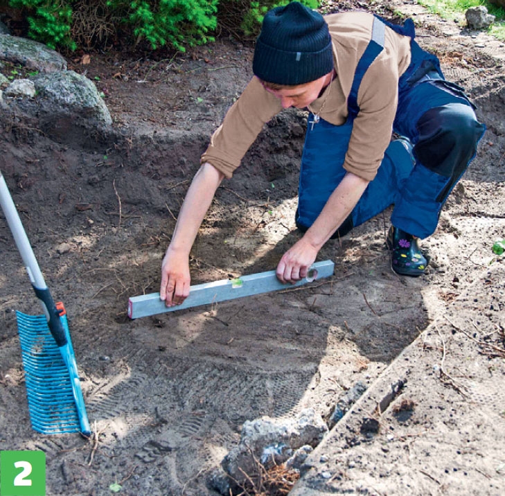 Jämna ut underlaget, så att det blir plant, och regnvattnet kan rinna undan i jämn takt. Du kan t.ex. jämna ut det med ett vattenpass, då är det samtidigt lätt att kontrollera om underlaget är plant.