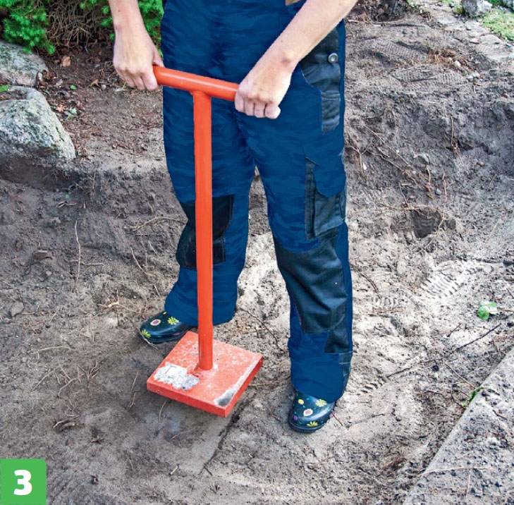 Underlaget komprimeras med en så kallad jungfru, så att det blir kompakt, och gärdsgården inte sätter sig. Du kan ev. tillverka en av en tung stolpe med ett handtag på.