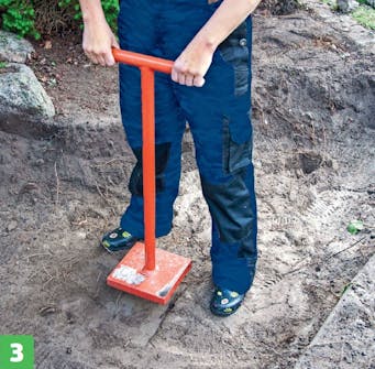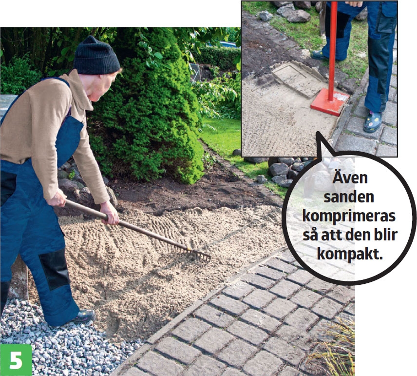 Du ska gräva bort det översta lagret jord och ersätta det med ett lager finsingel samt ett lager sättsand. Lagren komprimeras så att underlaget blir kompakt och inte sätter sig.