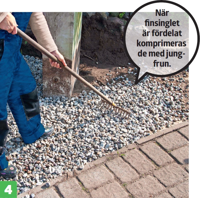 Häll på finsinglet och fördela det jämnt i ett lager på ca. 10 cm. Det räcker om jorden är sandig, som här. Har du mat- eller lerjord, måste stenlagret vara 20 cm. De små stenarna ger dränering under gärdsgården.
