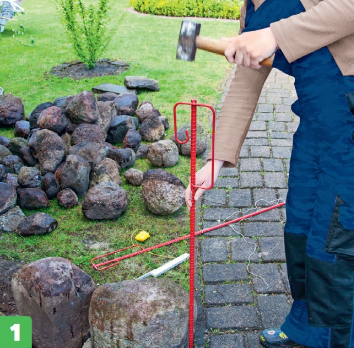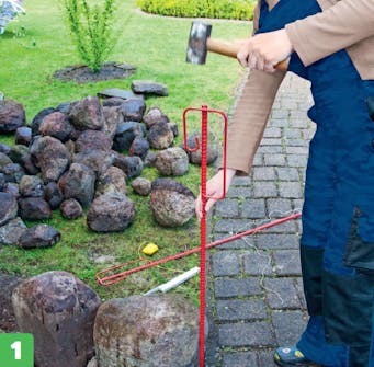 Slå ned stänger i marken som markerar var gärdsgården ska hamna. Det är viktigt att ha några linjer att rätta sig efter när du börjar sätta stenarna.