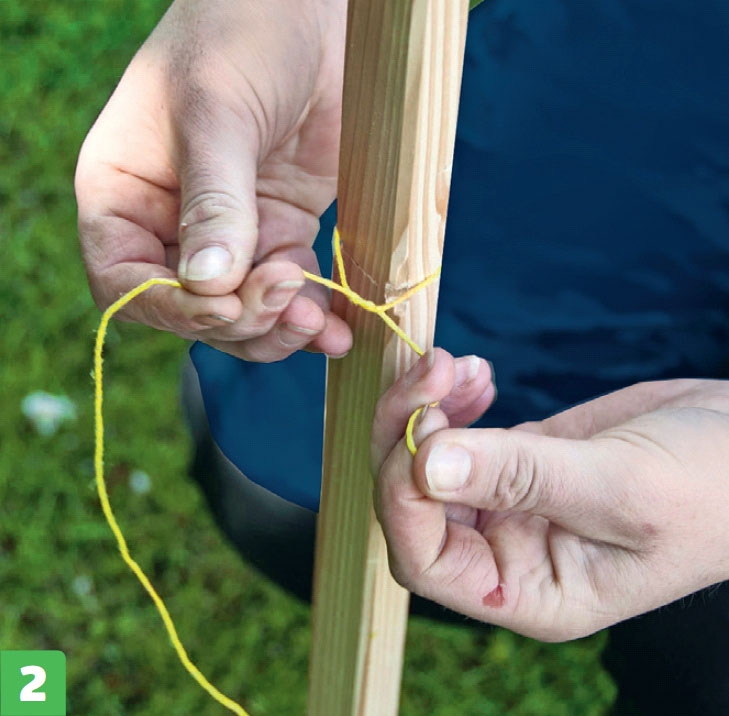 Bind fast ett murarsnöre i en pinne i den höjd gärdsgården ska byggas. Snöret knyts fast i stången som du har slagit ned marken i den ena änden av gärdsgården. Då kan du kontrollera höjden under tiden.