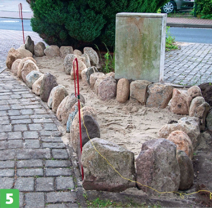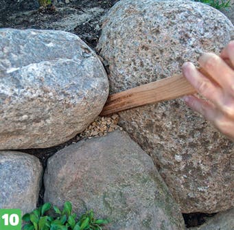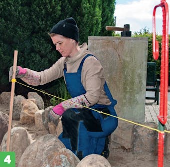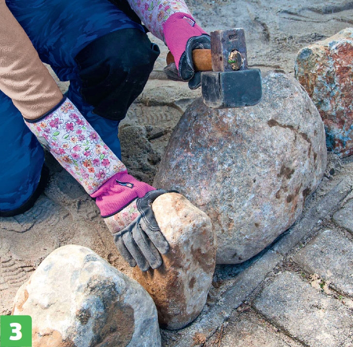 Sätt nu den första raden stenar. Sätt de största stenarna nederst, så många som det går. De slås ned i underlaget med en gummislägga.