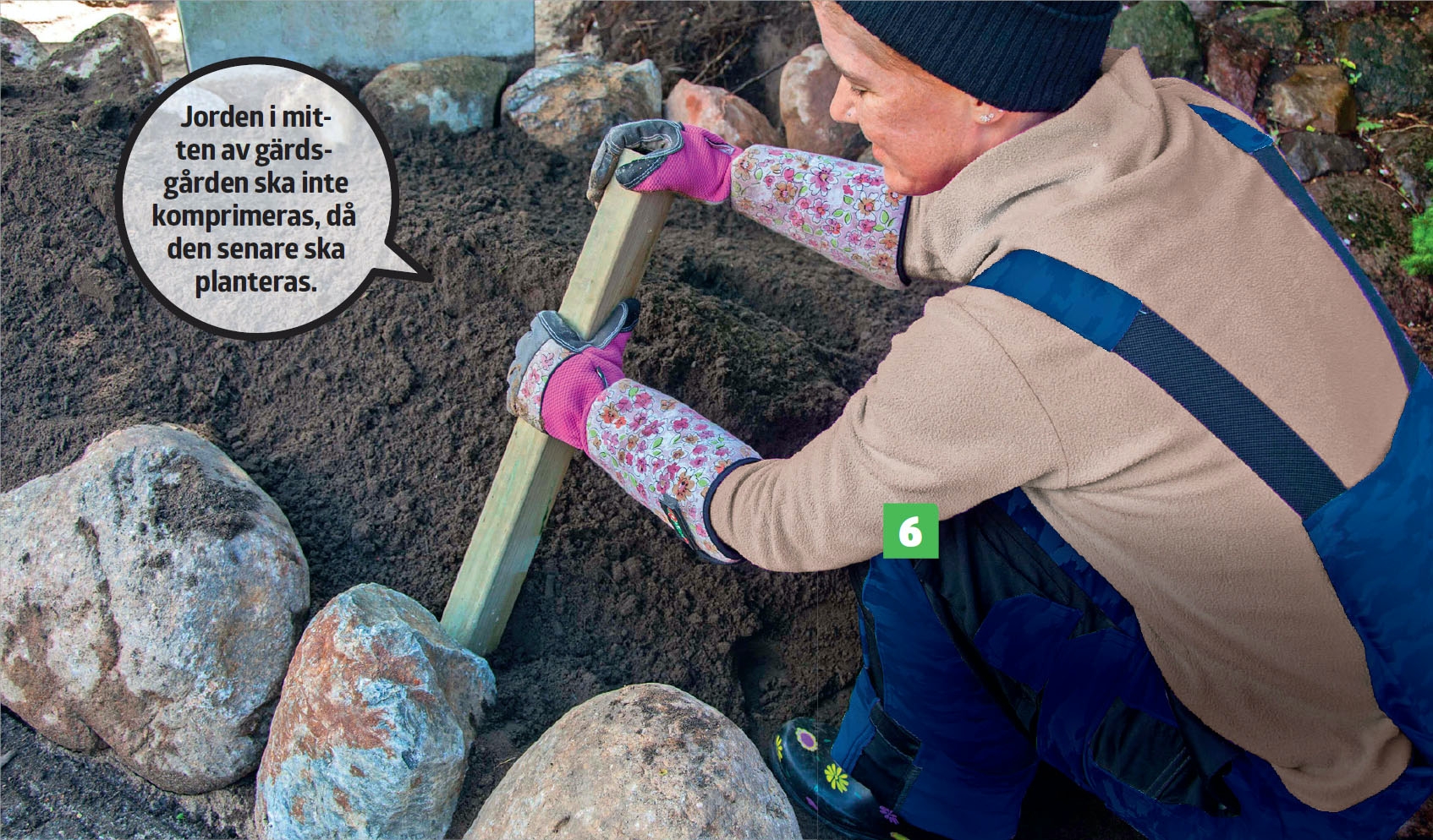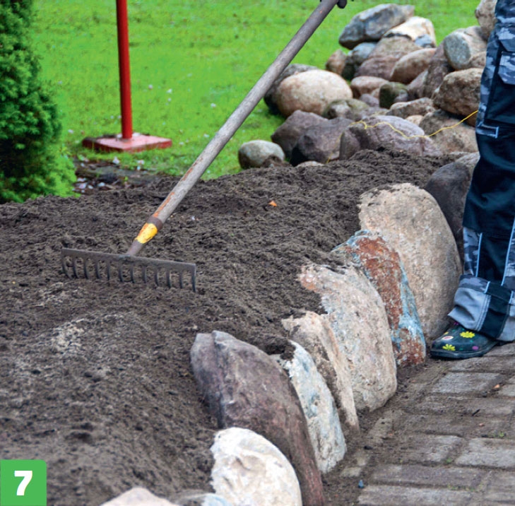 Fyll på mer jord och fördela den jämnt när du har tryckt till jorden bakom stenarna. Jorden fördelas fint med en räfsa, som samtidigt ser till att det översta jordlagret är löst och lätt att arbeta med.