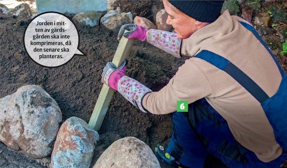 Du ska fylla gärdsgården med jord när den första raden sten är satt. Det håller dem på plats. Komprimera jorden bakom stenarna, så att de står så stabilt som möjligt. I takt med att gärdsgården blir högre fyller du upp med mer jord.