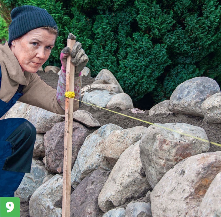 Kontrollera höjden ofta med din mätpinne med murarsnöre, när du närmar dig önskad höjd på gärdsgården. Tänk över hur du vänder de översta stenarna, så att du får en fin avslutning i toppen.