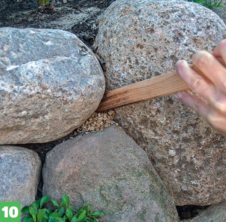 Större hål fylls ev. med grus, så att jorden inte rinner ur. Grus med en kornstorlek på 3-8 mm är lagom. Gruset trycks på plats med en pinne, så att det kommer hela vägen in i springorna.