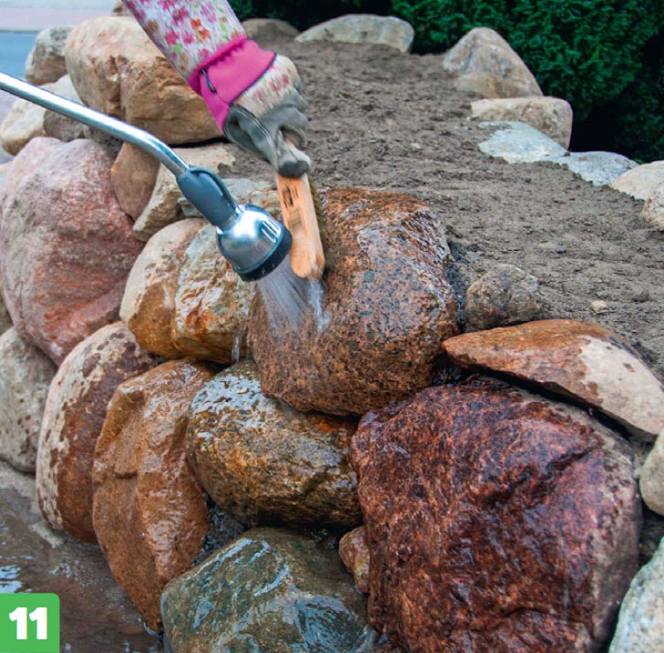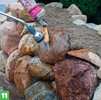 Avslutningsvis tvättas stenarna. Det kan inte undvikas att de blir smutsiga när du bygger. Men det går lätt att skrubba dem rena med vatten och borste.