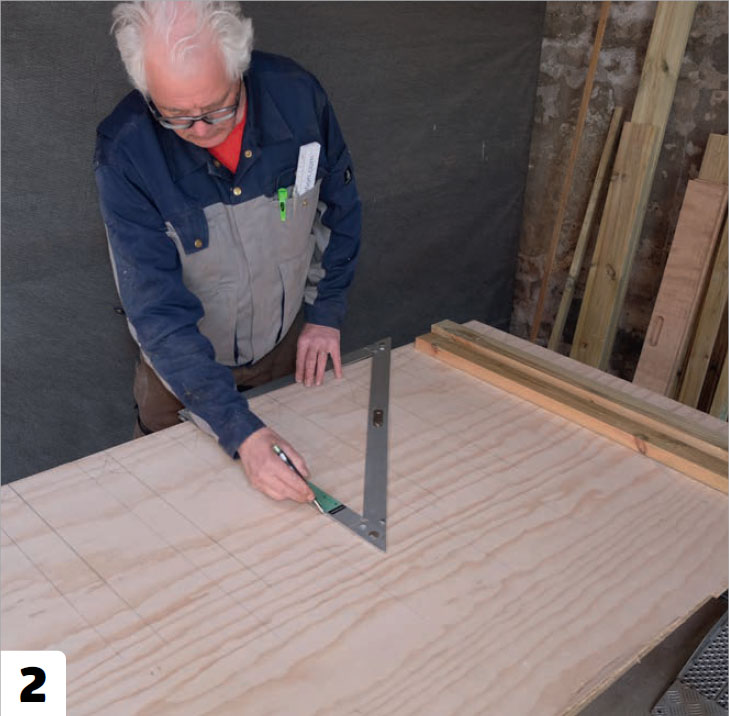 Det är en bra idé att bygga grinden på ett underlag, t.ex. en plywoodskiva, där du kan rita upp grinden. Då är det mycket lätt att lägga spjälorna på plats om du har ritat deras placering på underlaget.