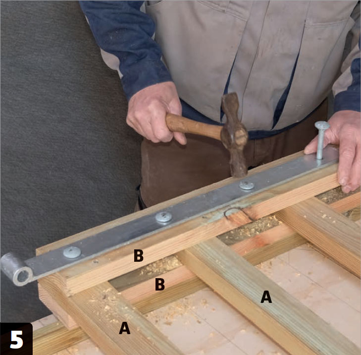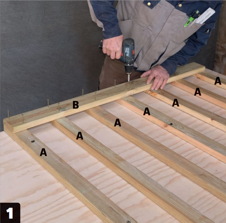 Lägg spjälorna (A) på underlaget och skruva fast dem i tvärslån (B) som placeras vid änden så att den fluktar med spjälorna. Förborra med ett 3 mm borr innan du skruvar fast spjälorna med 55 mm skruv.