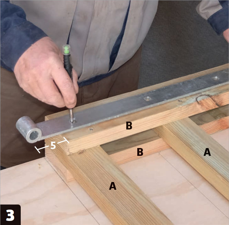 Markera för de kraftiga gångjärnsbeslagen när tvärslåarna (B) har monterats i grindens båda ändar. Gångjärnet placeras mitt på tvärslån, så den ska här sticka ut 5 cm över kanten där grinden ska hängas.