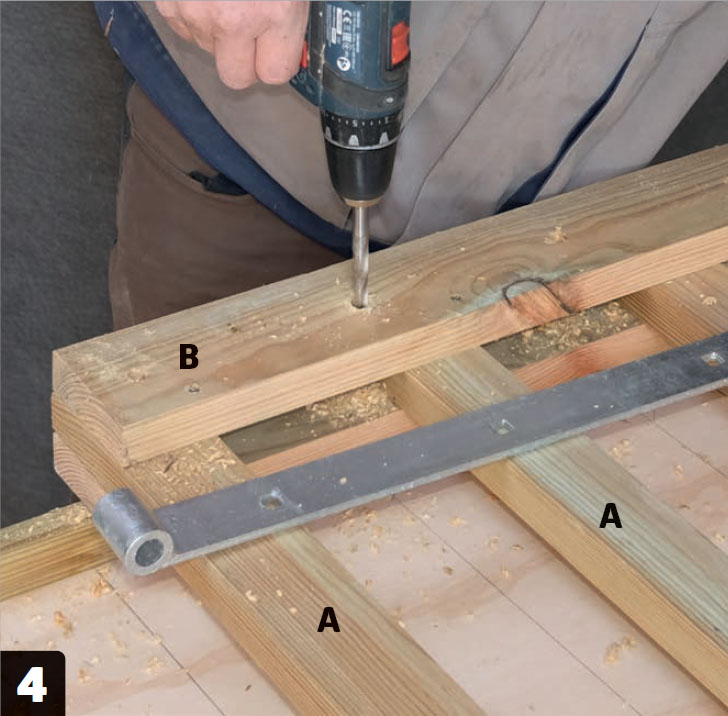 Förborra till bultarna som gångjärnet ska fästas med, först med ett 6 mm borr sedan med ett 10 mm borr. Bultarna ska gå igenom båda tvärslåarna (B). Om det finns trärester kvar i hålen tas det bort med kniv.