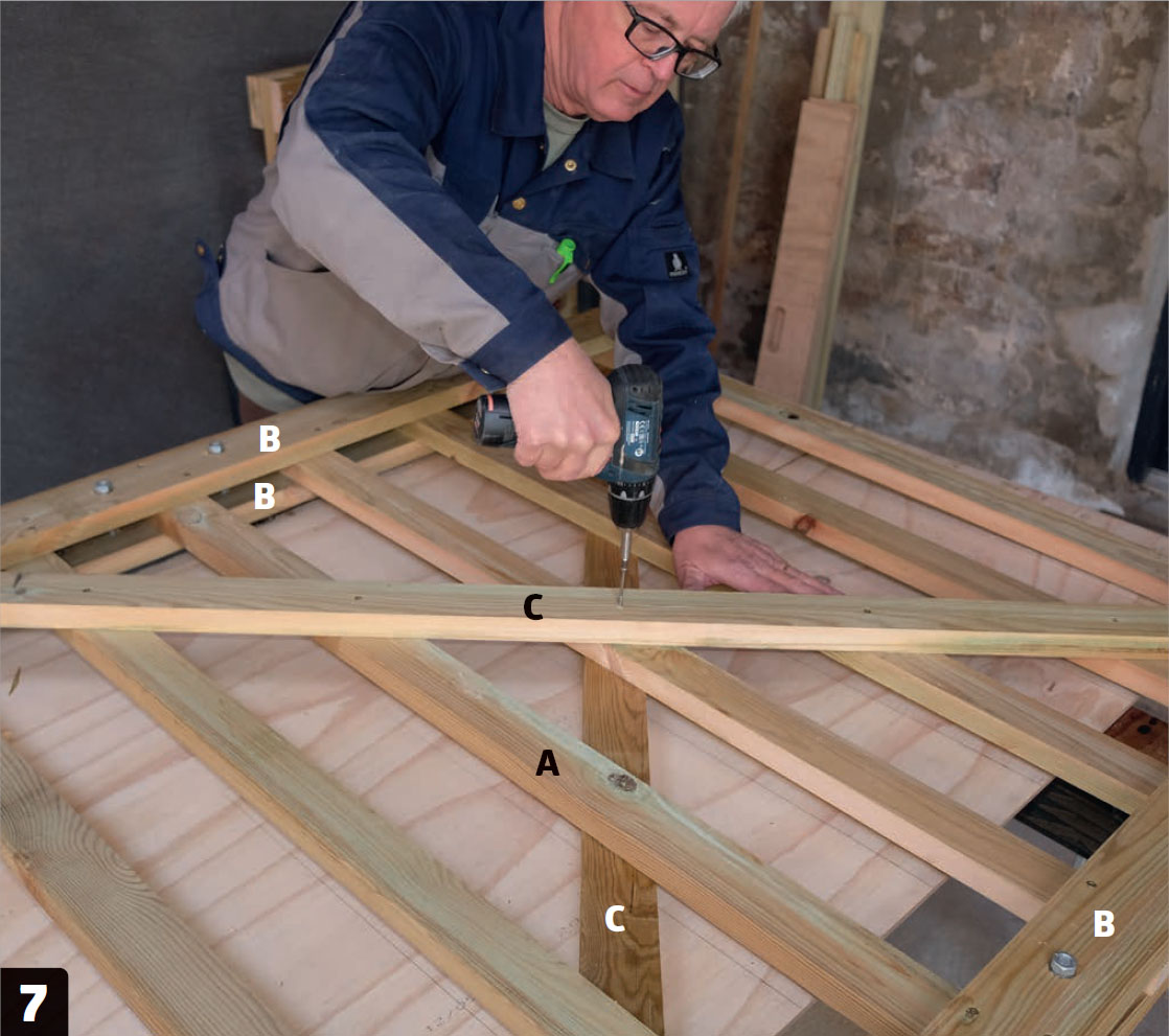 Kapa trallbrädorna så att du har alla delar. Det ska vara 7 spjälor (A) och 2 snedsträvor (C) som är 6 cm breda, samt 4 tvärslåar (B) som är 9 cm breda. Kapa brädorna med sänk- eller cirkelsåg.