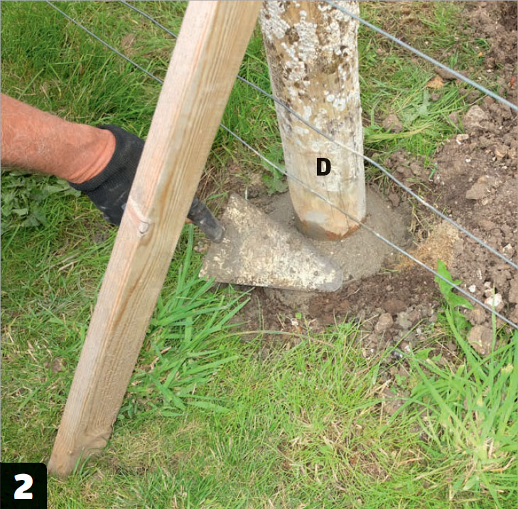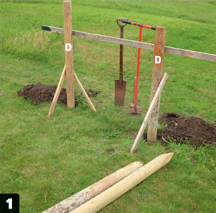 Gräv hålen till stolparna (D) tex med en jordborr. Hålen för de lodräta stolparna är ca 85 cm djupa, något mindre för de sneda. Avståndet mellan hålen är 120 cm. Kolla att de är raka och fixera dem med snedsträvor.