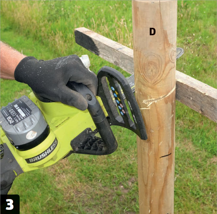 Såga av toppen på de lodräta stolparna. Stolparna ska vara 120 cm höga och ha ett fasat snitt upptill så att vatten kan rinna av. Fäst en hjälpbräda som du kan såga mot. En kedjesåg fungerar bra.