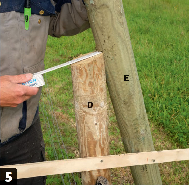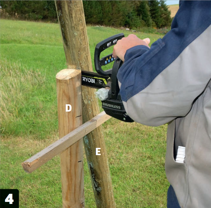 Gräv ut till den lutande stolpen (E) och ställ den mot stolpen (D). Stolparna hålls ihop tillfälligt med en hjälpbräda medan du sågar där stolparna möts. Såga flera gånger så att du får ett hack.