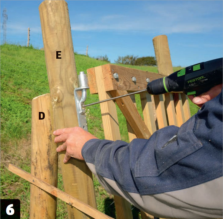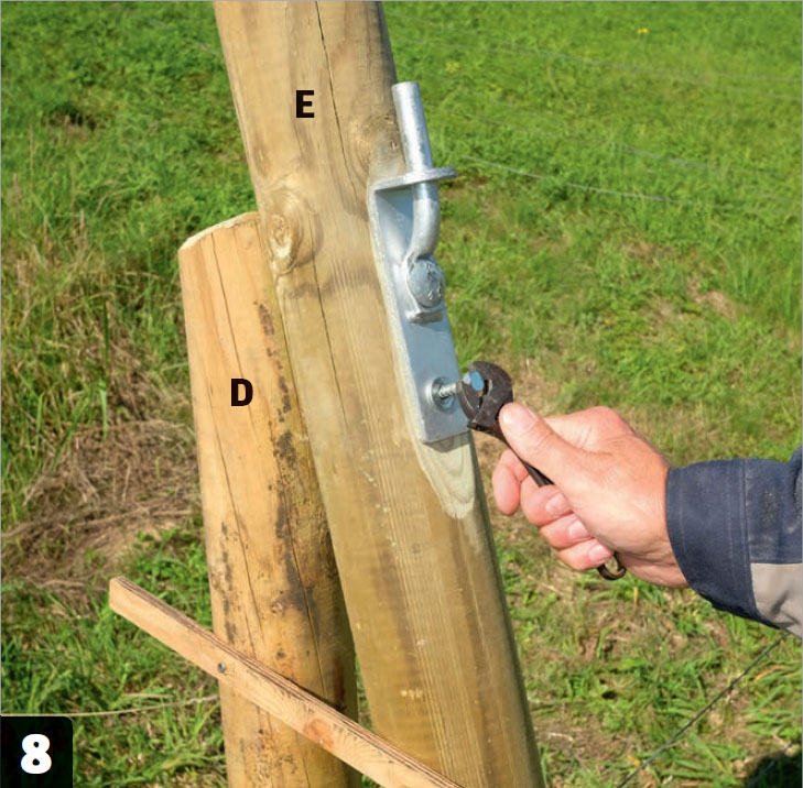 Montera två hakgångjärn med franska skruv, 8 x 80 mm, på stolpen. Stolparna i den andra sidan hålls ihop av en bult, 12 x 200 mm.