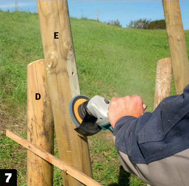 Slipa stolpen (E) jämn på framsidan där hakgångjärnen ska sitta. Då kommer de att sitta bra på de runda stolparna. Du kan tex använd en vinkelslip med en korn 60-slipskiva. Det går snabbt.