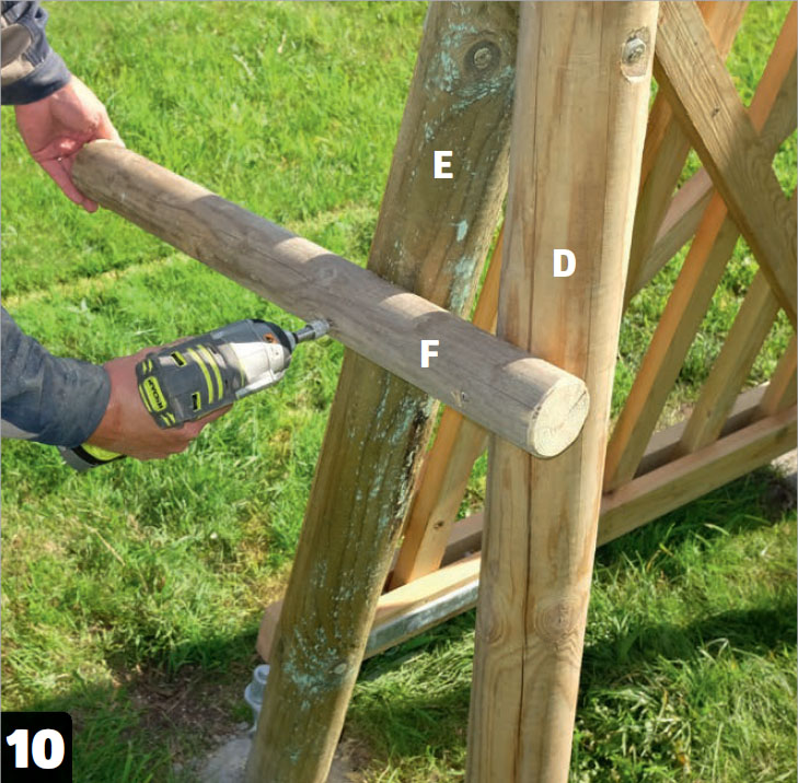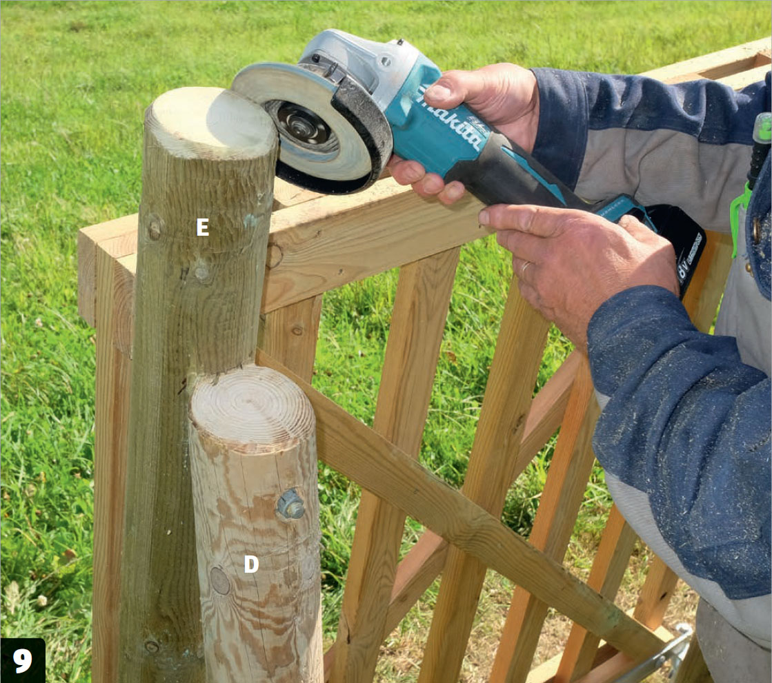 Häng upp grinden och kapa de långa stolparna (E). Därefter är det en god idé att slipa stolparna runt överkanten för att minimera risken för stickor i fingrarna.