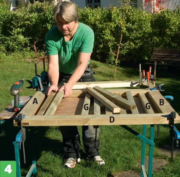 Vi sätter spjälorna (G) på plats. Medan limmet på grindens ram torkar sätter vi spjälorna på plats. Vi skruvar fast dem med träskruv. Kom ihåg att förborra!