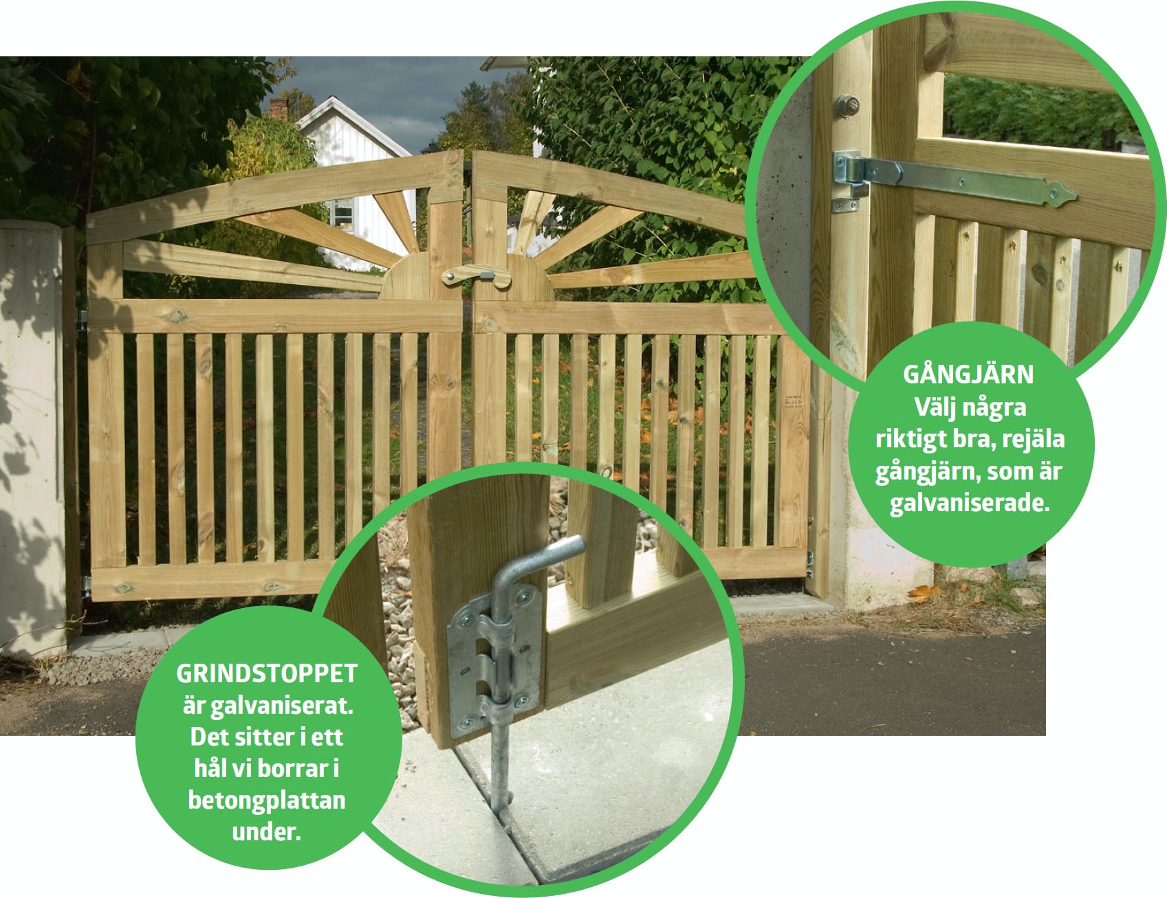 Vi har valt att använda polyurethan-lim, som är väldigt starkt, till att limma ihop grinden med. När limmet är torrt hänger du upp den på grindstolparna med galvaniserade gångjärn.