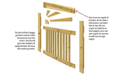 Se till att alla delar passar. När vi har sågat till grindens topp (C) och sett att det hela passar, kan vi börja limma ihop grinden.