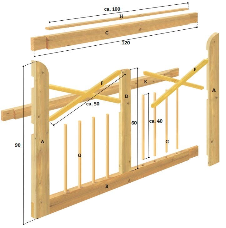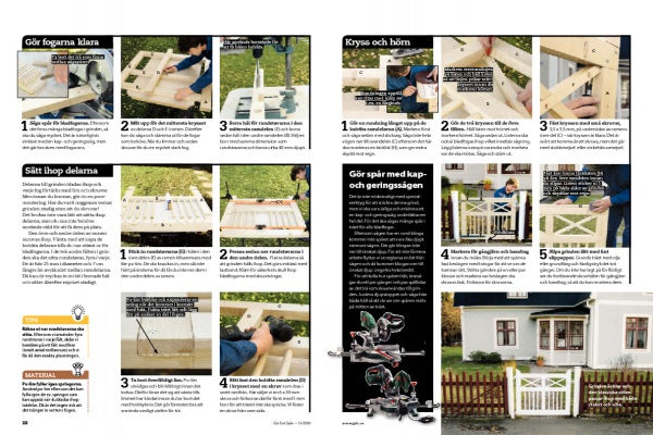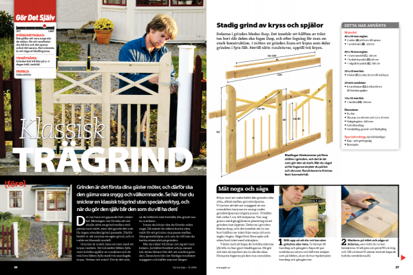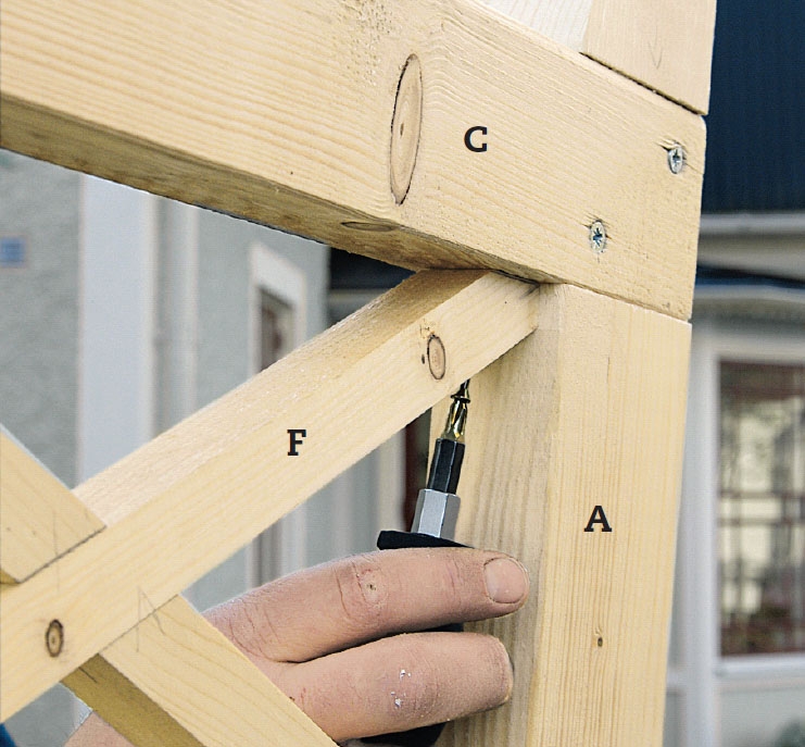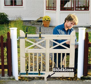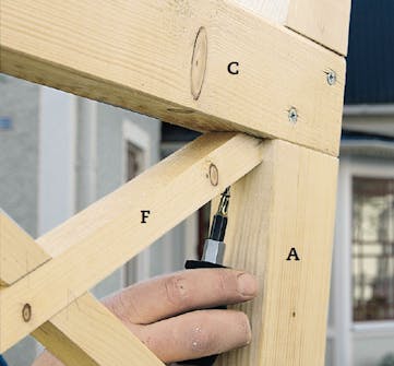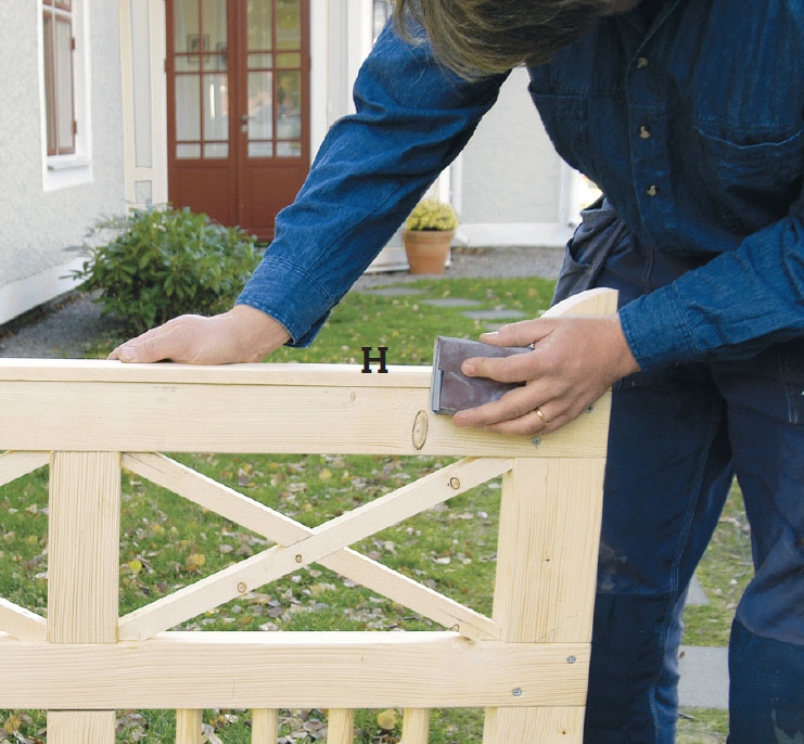 Delarna till grinden bladas ihop och varje fog förtärks med lim och skruvar. Men innan du limmar, gör du en provmontering. Har du varit noggrann verkar grinden stadig utan att du skruvar! Det brukar inte vara lätt att sätta ihop delarna, men du ska inte behöva använda våld för att få dem på plats.
