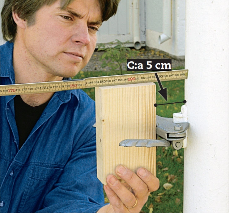 Börja med att mäta hålet där grinden ska sitta, alltså mellan grindstolparna. Vi tycker att det ser snyggast ut om ovandelen hamnar en aning under grindstolparnas högsta punkt. Vi håller här cirka 5 cm till stolparna. Var noggrann med gångjärnens placering så att grinden kan öppnas. Delarna i grinden bladas ihop, och det innebär att du tar bort hälften av träet från varje del som ingår i fogen. Såga först flera spår och stäm bort träet med stämjärn.