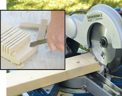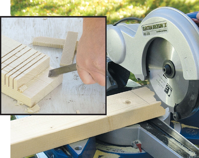 Såga spår för bladfogarna. Eftersom det finns många bladfogar i grinden, så ska du såga mycket. Det är naturligtvis enklast med en kap- och geringssåg, men det går bra även med fogsvans.