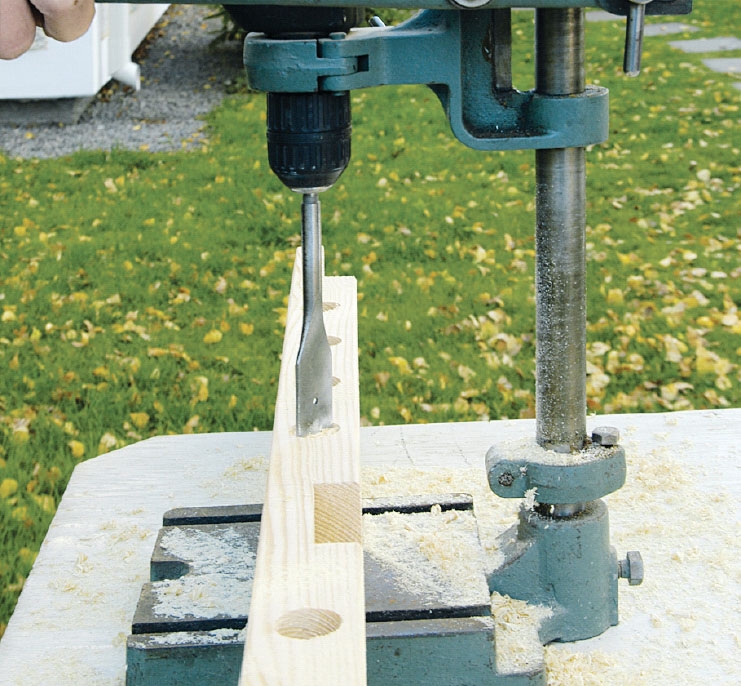 Den övre och nedre delen av ramen skruvas ihop. Vänta med att kapa de lodräta delarna tills du har stämt ur för bladfogarna. I de två undre fälten i grinden ska det sitta rundstavar, fyra i varje. De är här 25 mm i diameter och 7 cm längre än avståndet mellan ramdelarna. Då kan de tryckas in en bit i borrade hål och sitter därefter mycket stadigt.