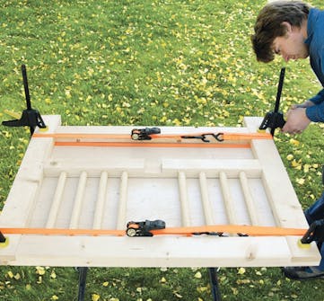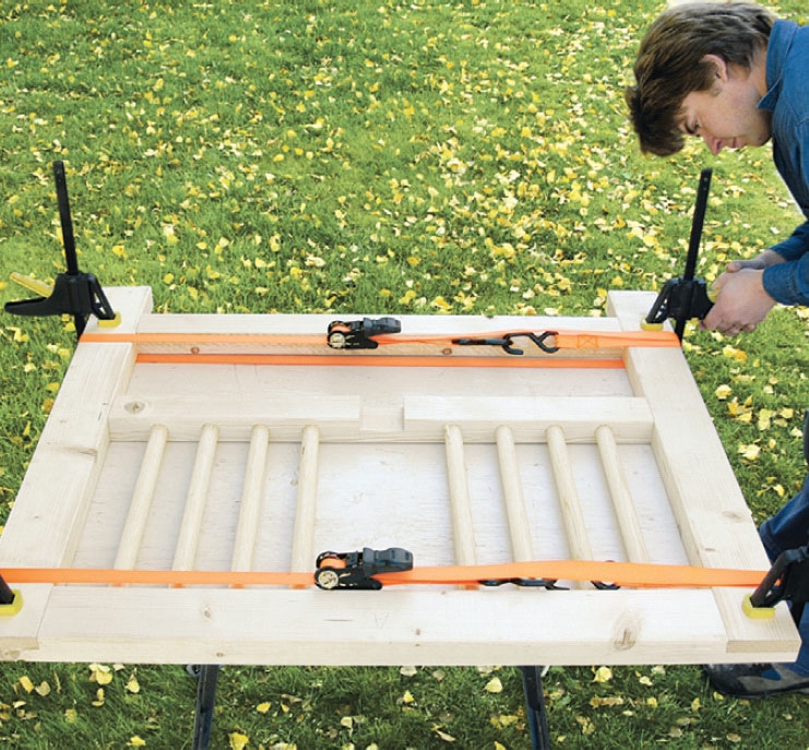 Pressa sedan ner rundstavarna i den undre delen. Fixera delarna så att grinden hålls ihop. Det görs enklast med lastband. Kläm för säkerhets skull ihop bladfogarna med skruvtvingar.