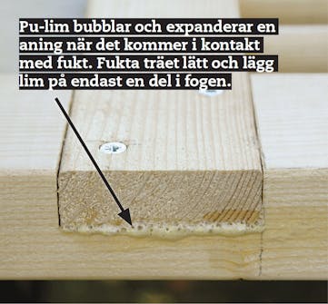 Ta bort överf ödigt lim. Pu-lim utvidgas och blir klibbigt innan det torkar. Därför lönar det sig att vänta tills limmet har härdat innan du tar bort det med hobbykniv. Det går förresten bra att använda vanligt utelim för trä.