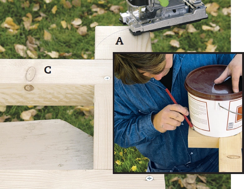Gör en rundning längst upp på de lodräta ramdelarna (A). Markera först och såga sedan med sticksåg. Såga inte hela vägen ner till ovandelen (C) eftersom det här ska monteras en täcklist (H), som ger extra skydd mot regn.