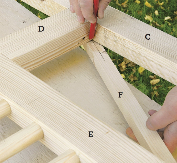 Mät upp för det mittersta krysset av delarna D och E i ramen. Därefter kan du såga och stämma ut för de fogar som behövs. När du limmar och sedan skruvar får du en mycket stark fog.