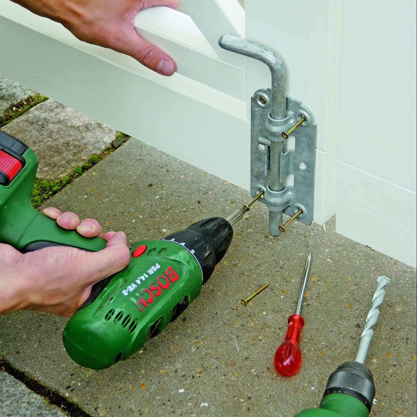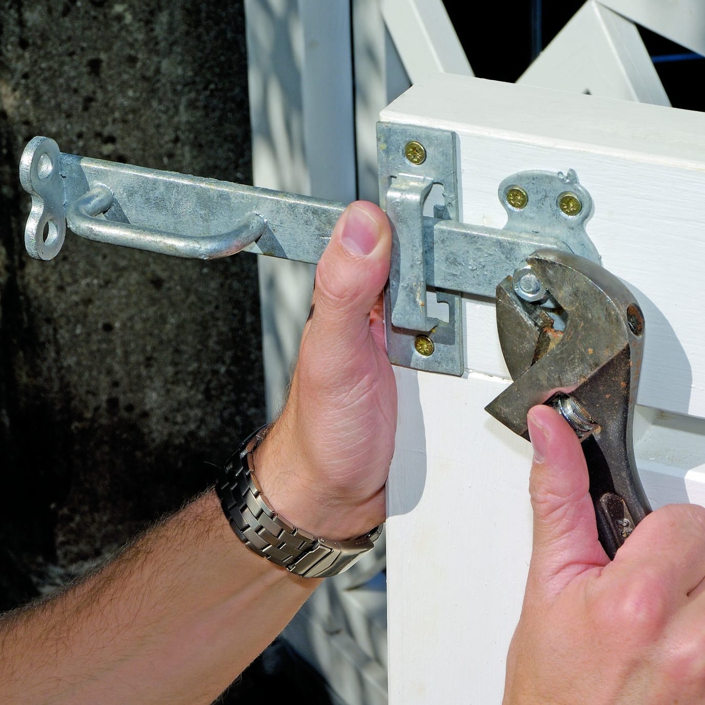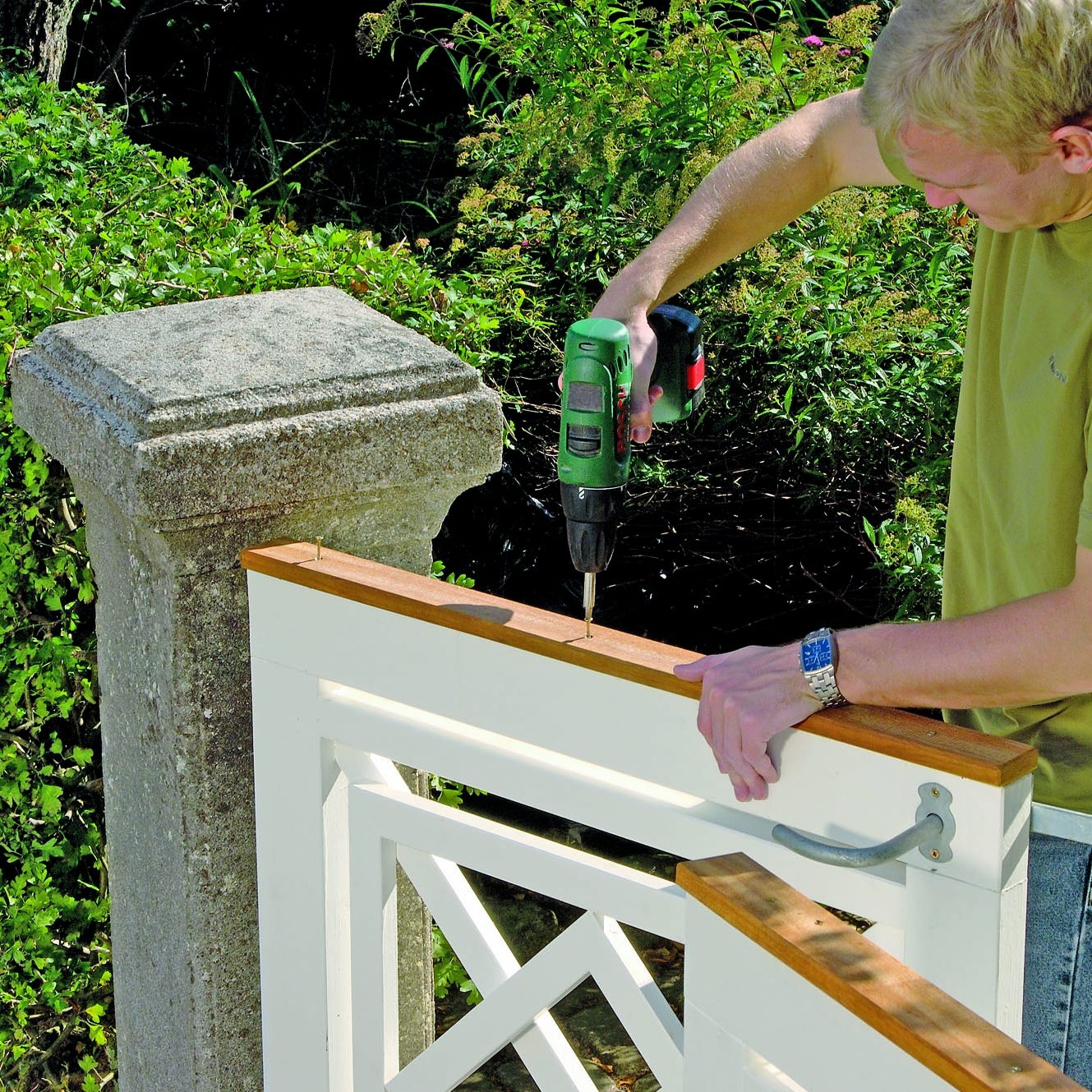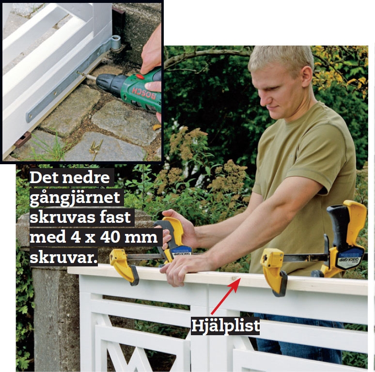 När grinden sitter där den skall sätts en tving över gånjärnet. Skruva fast gångjärnet i grinden med 4 x 40 mm skruvar.
