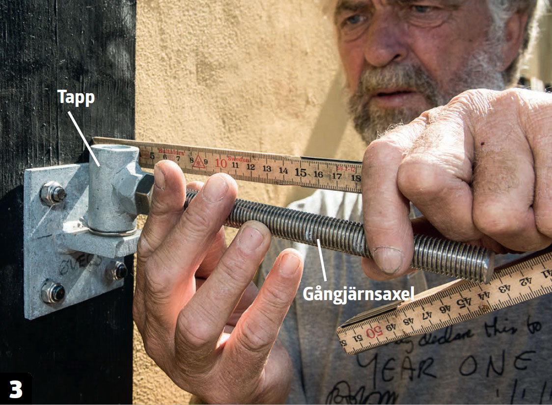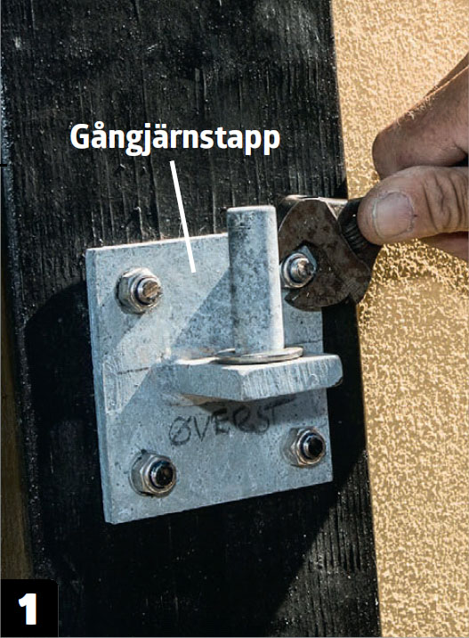 Den tunga grinden måste hänga på kraftiga gångjärn. Här har vi valt en sort med en gångjärnsaxel som borras in i grinden och hängs på gångjärnstappar på stolparna.