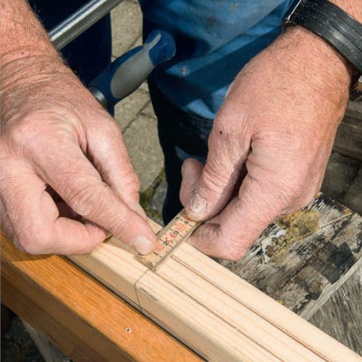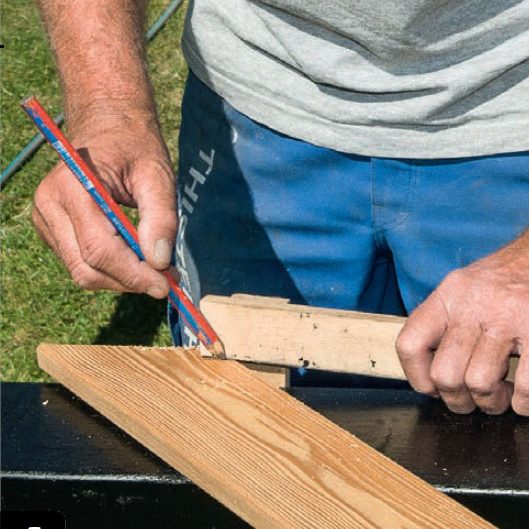 Börja med en lång bräda. Vi har valt att brädorna ska sluta 10 mm in på ramen. Det markerar vi med hjälp av mallen och sågar till brädan.