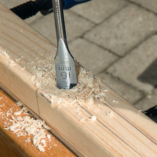 Borra igenom med ett 16 mm-centrumborr, först från den ena och sedan från den andra sidan. Då blir det mest exakt.