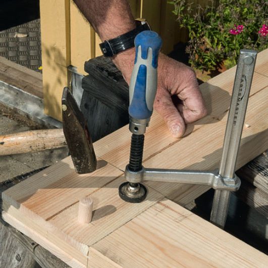 Mät avståndet mellan sågspåret för tappen. Det är här 16 mm. Spänn fast delarna. En bräda hjälper till att hålla dem.