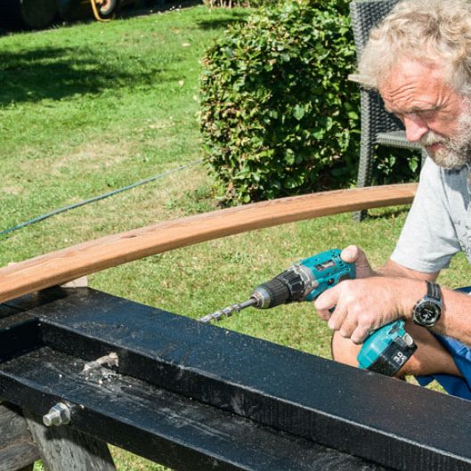 Med en distanskloss (fastskruvad på en lite längre bräda) säkrar vi 4 cm avstånd mellan brädorna, som sågas till i ändarna med ett 45graders snitt, så att de följer ramarna.