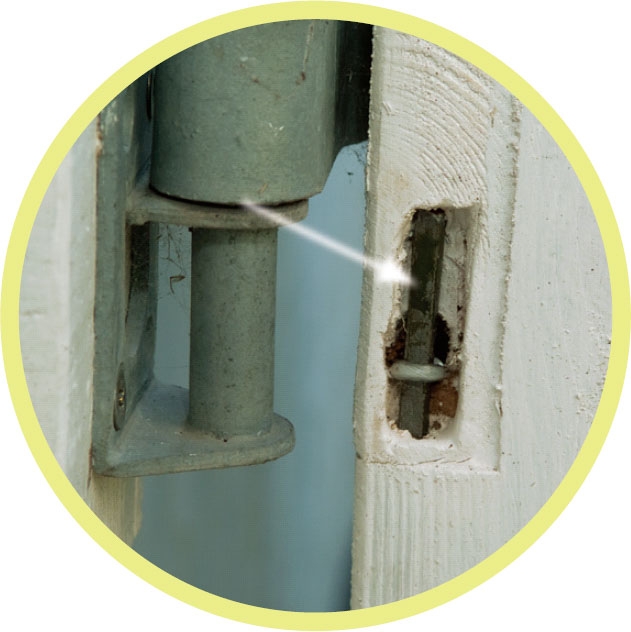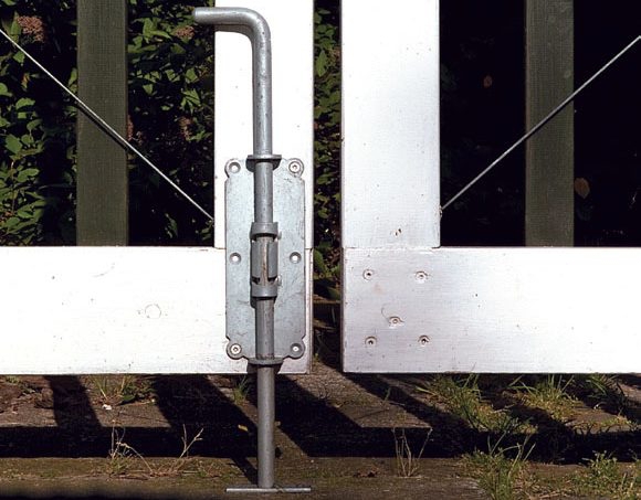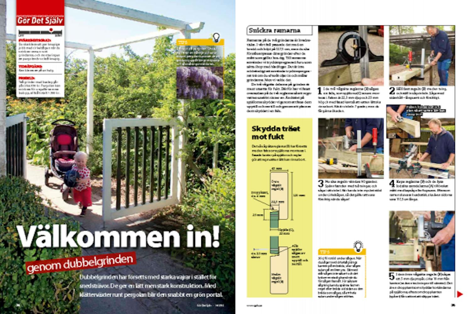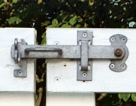 När ramarna och spjälorna har målats och sätts ihop, är det dags att skruva fast gångjärn och beslag. På väggen och stolpen hakas grindarna fast med hakgångjärn. Till öppning och stängning har vi valt en grindklinka och på den ena grinden sätter vi en skjutregel.