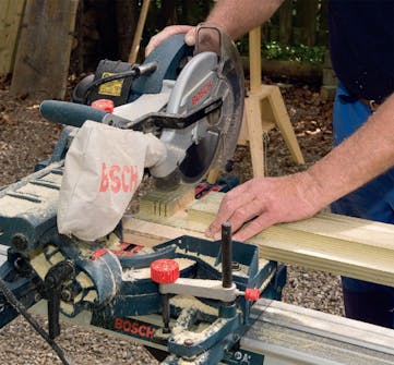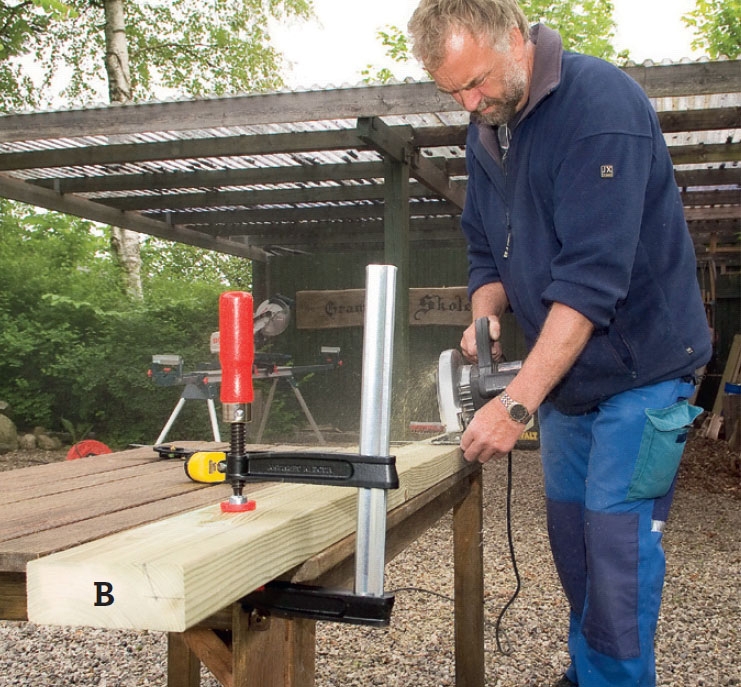 Nu ska regeln vändas 90 grader. Spänn fast den med två tvingar, och såga i rät vinkel. Här har du inte mycket stöd under cirkelsågen, så det gäller att vara försiktig när du sågar!