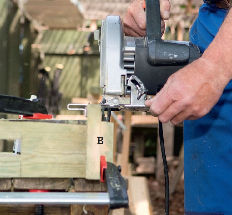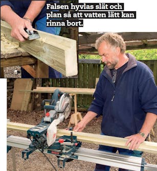 I de två vågräta reglarna (B) sågas en fals, som spjälorna (C) senare monteras i. Falsen är 22,5 mm djup och 25 mm hög ch med fasad kant så att vatten lätt ska rinna bort. Här är vinkeln 7 grader, men du får gärna öka den.