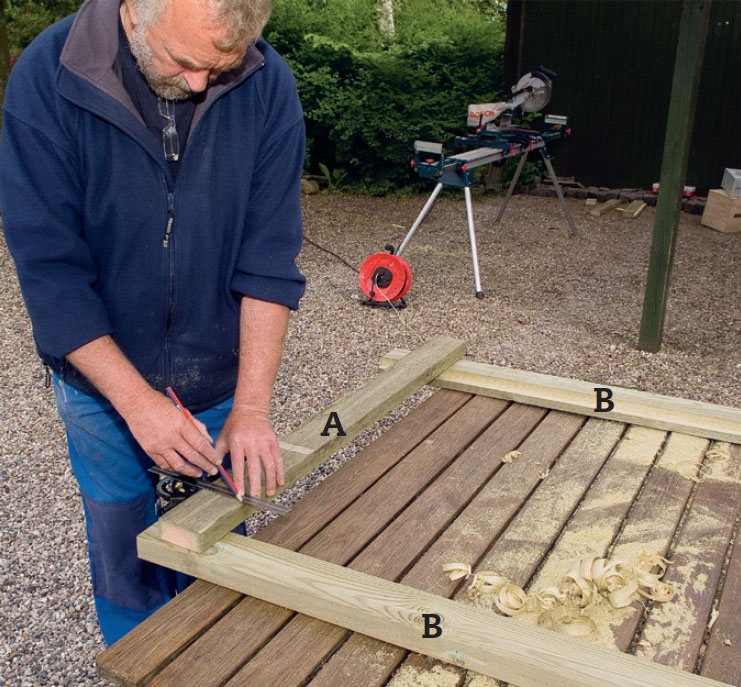 Kapa reglarna (B) och de fyra lodräta ramdelarna (A) till önskat mått med kapsåg eller fogsvans. Eftersom ramen ska vara kvadratisk, ska även sidorna vara 117,5 cm långa.
