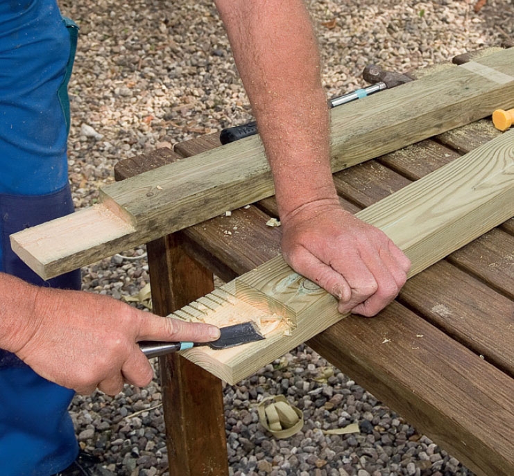 Med ett smalt stämjärn tar du bort allt trä mellan hålen tills det bildas ett spår. Spåret ska vara cirka 6 cm långt. Då får du plats för ett mothåll av en 5 cm lång galvaniserad stålspik.