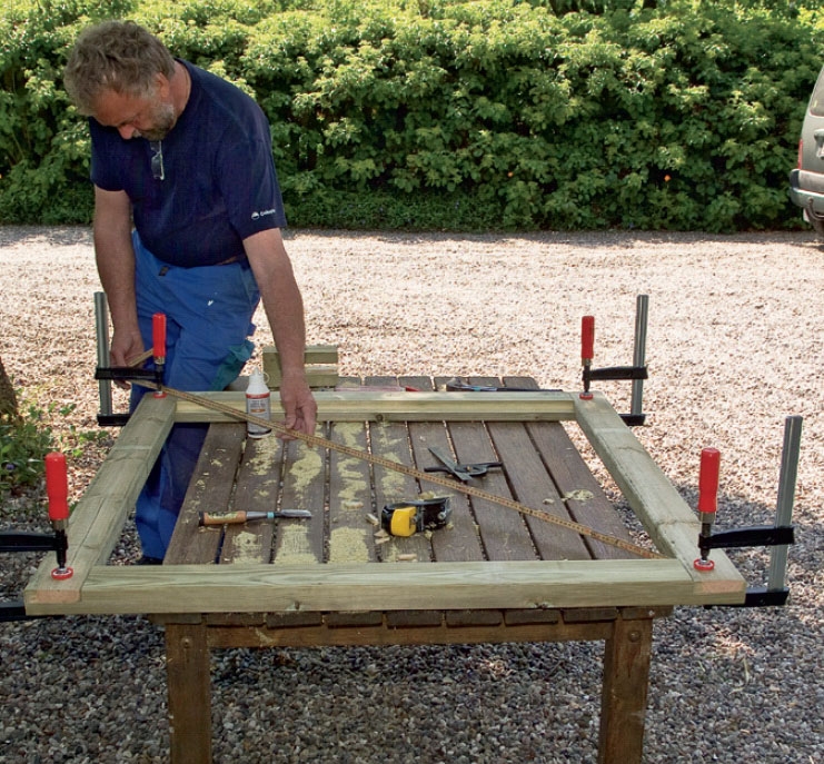 Delarna sätts ihop och hörnen fixeras med tvingar så att du kan kolla att de verkligen blir vinkelräta. Till det kan du använda en stor vinkel eller mäta diagonalerna. Är de exakt lika stora, ska ramen vara vinkelrät.