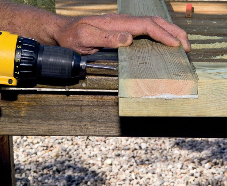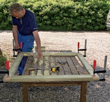 Till sist limmas fogarna med pu-lim och förstärks med skruvar. Ta bort tvingarna endast runt ett hörn i sänder medan du limmar och skruvar. Sätt på tvingen igen innan du lossar nästa tving.
