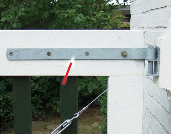 En vajer ska monteras så att den går från det övre hörnet på gångjärnssidan snett neråt. Det är tvärtom mot hur en snedsträva av trä monteras. Vajern sitter fast i ett mothåll i båda ändar, och det placeras i ett spår (se foto). Noten borras och stäms ut i bladfogen.
