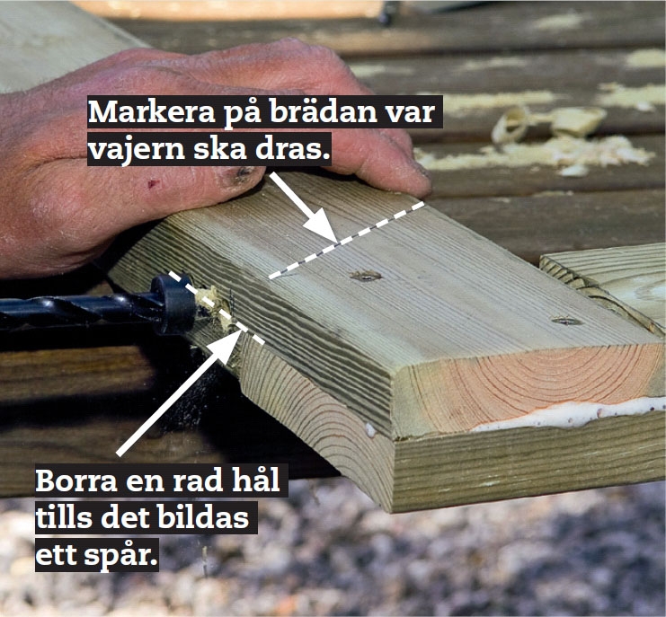 Kolla en extra gång att du monterar vajern åt rätt håll, innan du med en 6 mm borr borrar ett långt hål genom bladfogen. Hålet ska vara cirka 10 cm långt. Om du inte har ett långt borr, kan du borra från båda sidor av brädan.