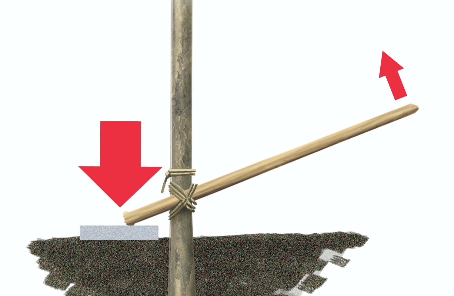 Det finns en del bra knep att ta till när man ska dra upp stolpar som sitter hårt fast. Först vickar man stolpen och kör så att säga runt med den så att hålet runt den vidgas. Om det inte räcker kan du binda fast en kraftig stör så långt ner på stolpen att du kan lägga en stenplatta under ena änden och använda stören som en hävstång.